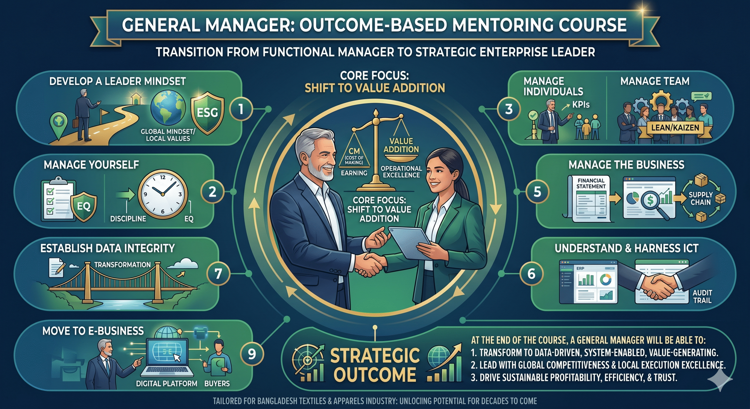 In the context of the Bangladesh Textiles and Apparels industry—a sector characterized by high-pressure deadlines, complex global supply chains, and a massive labor force—the role of a General Manager (GM) is pivotal. To transition from a functional head to a strategic leader, the mentoring outcomes are focused on both technical modernization and high-level soft skills.